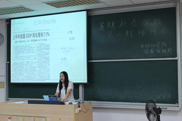 第二期培训在第一期整体介绍的基础上,对新闻稿、摄影、调研报告进行了专项培训。院团委污污漫画主任赵星星对新闻稿的写作做了一些指导,她对新闻稿的写作方法、基本要求、基本结构等方面进行了详细的讲解。暑期社会实践精彩照片奖得主张苏哲指出拍照的核心是新闻价值,并且强调了新闻照、人文照、风景照拍摄技巧的不同。2013年暑期社会实践校级明星团队“秸秆行动”的队长张根源则为大家阐述了整个调研的实施过程,从前期准备到过程再到后期加工,每一步都是一次成功调研的关键。最后院团委实践部部长王鹤彬做了总结发言,再次强调了一些注意事项。