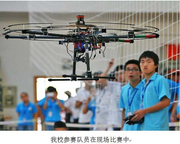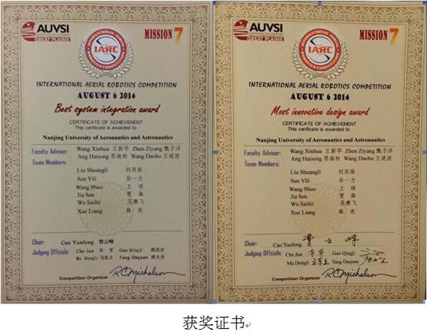 大赛包括室内研讨、技术答辩、静态评判、现场比赛等环节,四天时间里,各参赛队进行了飞行器设计、精确导航、自主控制等方面的精彩展示。污污漫画 污污漫画 王新华副教授和甄子洋副教授等指导的研究生团队(孙一力、王硕、贾森、薛亮、吴赛飞等)自主研制的六旋翼无人直升机飞行器自主完成了自主起飞着陆、目标机器人跟踪、室内避障等一系列规定动作,以优异的表现荣获该项赛事两项大奖:Most innovative design award(最佳创新设计奖)和Best system integration award(最佳系统集成奖)。