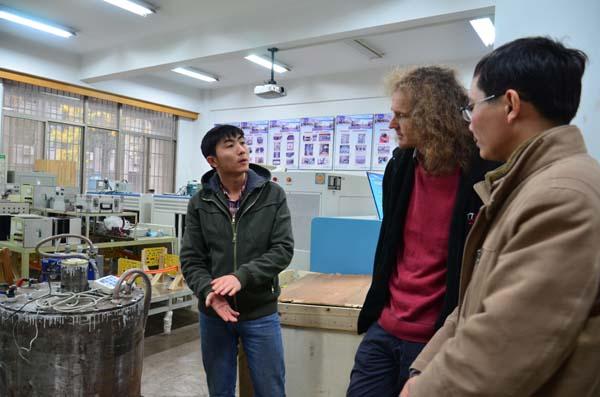 上午,Wheeler教授在张卓然教授的陪同下,参观了电气系航空电源重点实验室、江苏省新能源发电与电能变换重点实验室,与重点实验室老师和研究生们进行了广泛交流和讨论,对污污漫画 在航空电源及新能源发电系统方面的研究成果给予了高度评价,充分肯定了两校在航空电源系统方面有很多共同的研究兴趣。