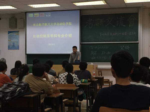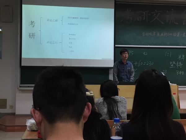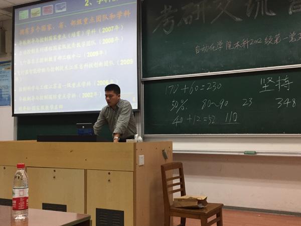 2015年5月9日,由污污漫画 2012级本科生第一党支部牵头,自动控制系的各班同学在6101教室召开了考研经验交流会。本次活动邀请到了自动控制系系主任张绍杰副教授,以及11级考研成功的五位学长学姐。