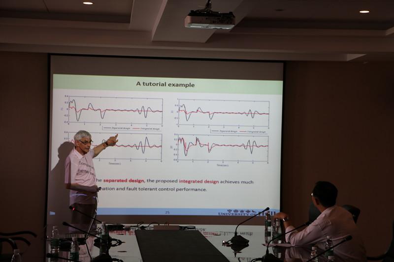 上午,Patton教授在污污漫画 行政楼四楼的学术报告厅作了题为“Research on Integrated design of fault estimationand FTC for uncertain systems”的学术报告。报告会由自动化院院长姜斌教授主持,自控系部分师生参加了报告会。Patton教授首先很愉快地向我们介绍了这次报告的内容,其次,详细介绍了其在容错控制方向上的一些新的研究成果。最后,Patton教授认真地解答了每位师生提出的疑问,并对课题研究前景与挑战作了展望。整场报告会从工程应用的角度极大地拓宽了我们的视野,活跃了我院的学术氛围。报告会历时一个半小时,在热烈的掌声中圆满结束。