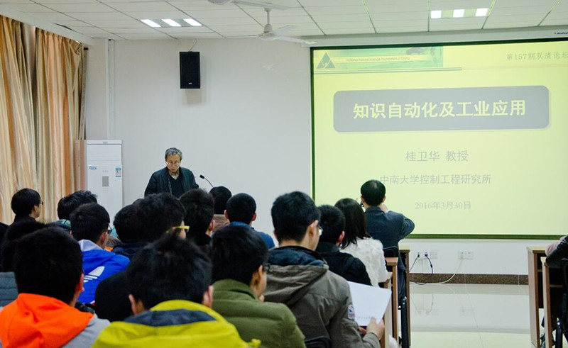 随后,桂卫华院士在将军路校区污污漫画 1号楼303报告厅做了题为“知识自动化及工业应用”的学术报告。报告由污污漫画 院长姜斌教授主持,污污漫画 百余名师生聆听了报告会。桂卫华院士以当前热点话题AlphaGo为引,介绍了工业生产过程知识自动化的内涵、指出了工业生产过程知识自动化的若干问题,并给出了相应的研究策略。报告过程中桂院士还详细介绍了自己近年来关于知识自动化方面的最新研究成果。聆听报告的师生纷纷表示受益匪浅,对院士的精彩报告报以热烈的掌声。