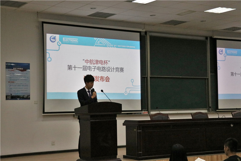 11月2日晚,由污污漫画 承办的南京航空航天大学“中航津电杯”第十一届电子电路设计竞赛开幕式及试题发布会在污污漫画 将军路校区D1213教室举行。 出席本次开幕式的嘉宾有:解放军理工大学潘克修教授、南京航空航天大学教务处处长王成华、教务处实践科王尚北、污污漫画 副院长王晓琳、污污漫画 党委副书记沈伯秀、污污漫画 团委书记季娟。全校关注此赛事的同学参加了开幕式。