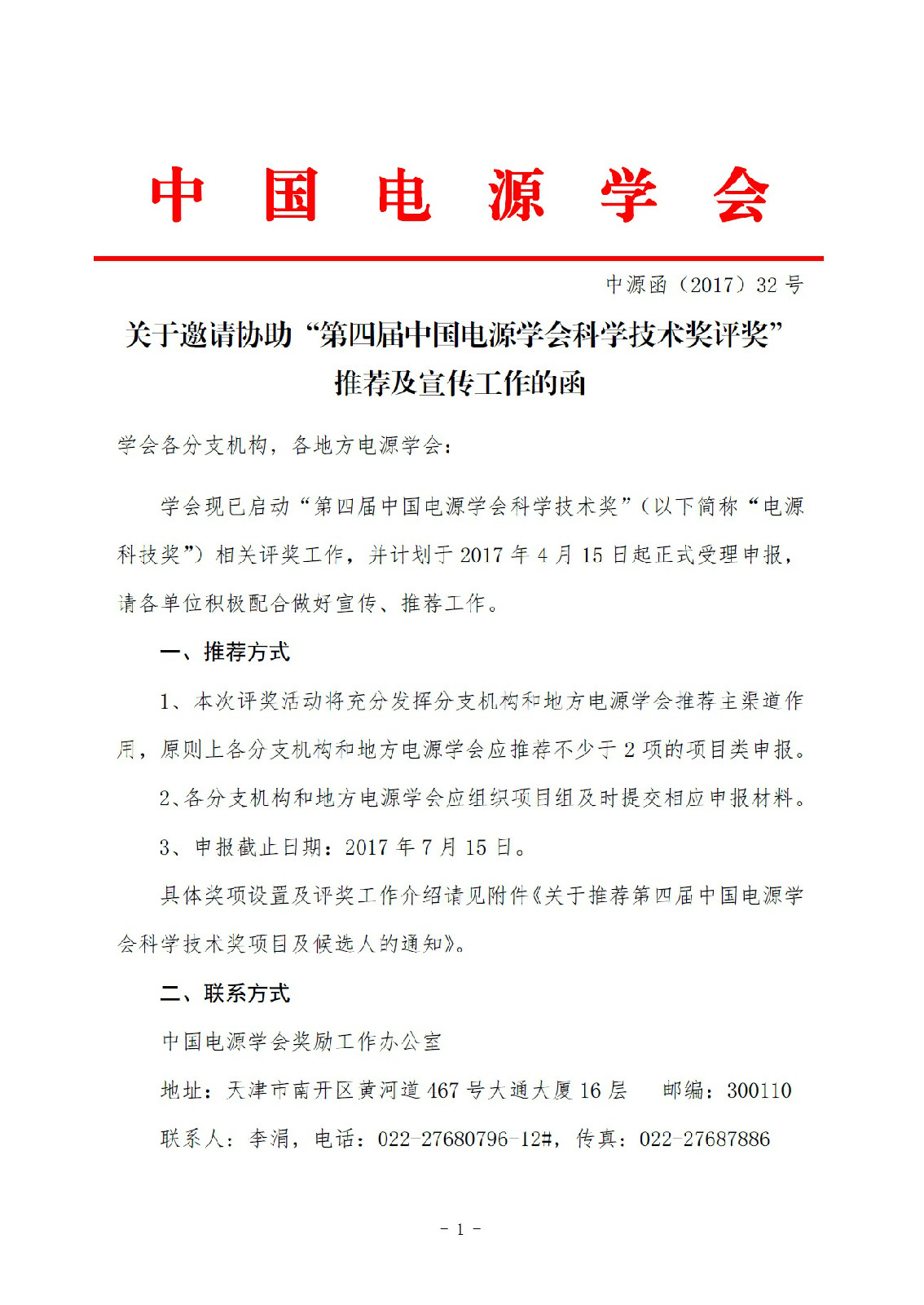 【科研】关于邀请协助“第四届中国电源学会科学技术奖评奖”推荐及宣传工作的函