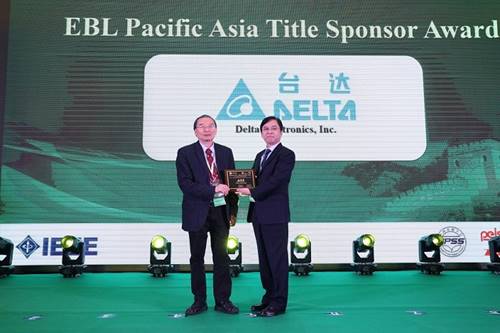 EBL亚太区竞赛指导委员会主席徐德鸿教授(左)为台达颁发冠名赞助单位奖牌,台达