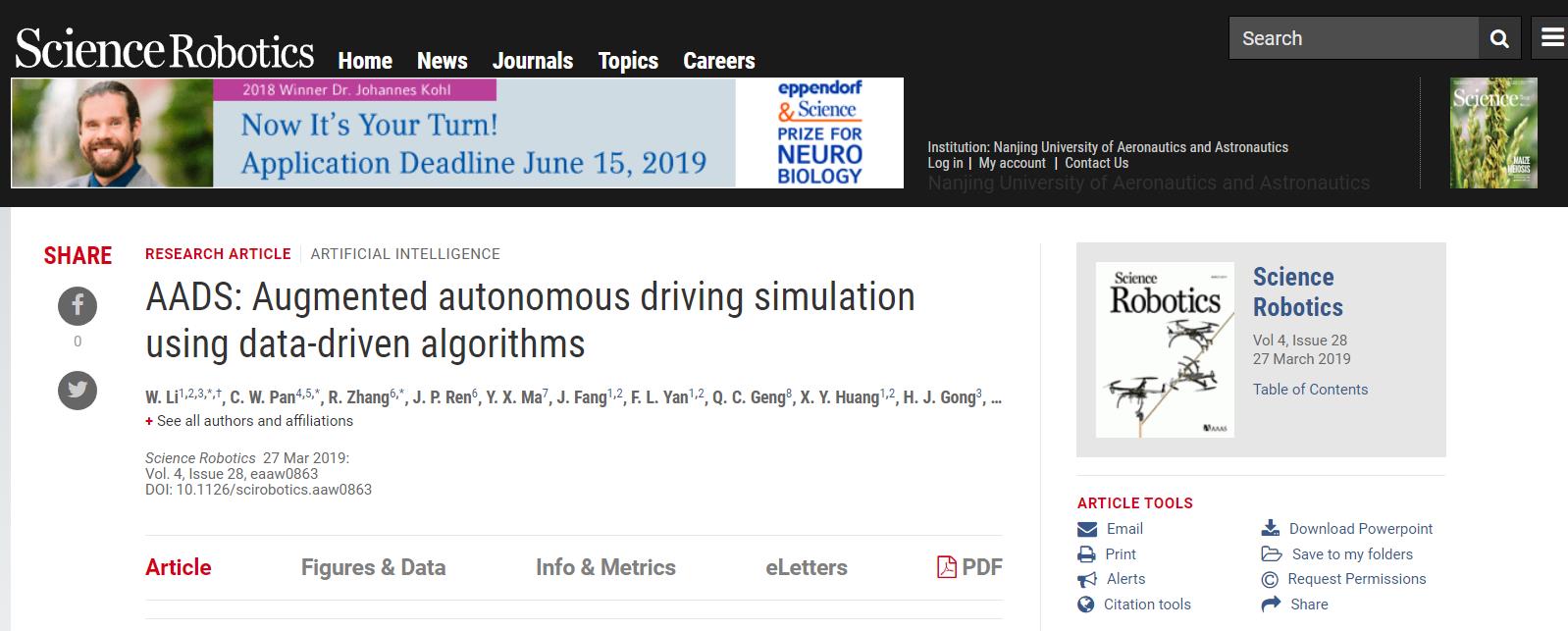 近日,污污漫画 自动化博士生李伟以第一作者和共同通讯作者身份,在《科学》杂志子刊《科学·机器人学》(Science Robotics)上刊登发表的学术论文“AADS: Augmented Autonomous Driving Simulation Using Data-Driven Algorithms”,该论文突破了现有的自动驾驶仿真技术存在的许多障碍。