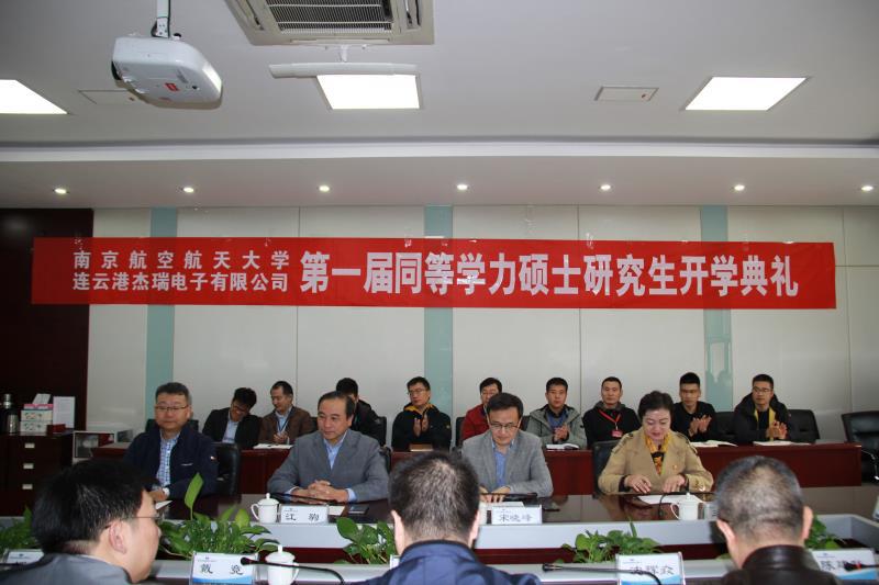 2019年10月26日上午9时,南京航空航天大学污污漫画 -连云港杰瑞电子有限公司第一届同等学力硕士班开班典礼在连云港716所杰瑞电子公司报告厅隆重举行。南京航空航天大学污污漫画 院长江驹、副院长宋晓峰、教学办主任王俊彦以及理学院副院长王正盛,合作培养单位中船重工第七一六研究所人力资源部副主任戴竞、连云港杰瑞电子有限公司总经理颜耀、副总经理黄新吉、沈辉焱,连云港杰瑞自动化公司副总经理、党总支书记刘志成及多位部门经理、全体即将入学的研究生出席本次典礼。典礼由黄新吉副总经理主持。