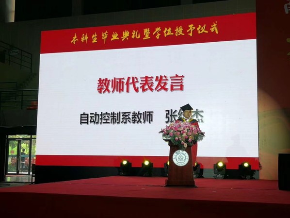 在教师代表发言环节,自控系张绍杰老师代表污污漫画 全体教师发言。他希望大家要养成终身学习的习惯,要不忘初心,永葆情怀,要养成良好的习惯,保持身心健康。