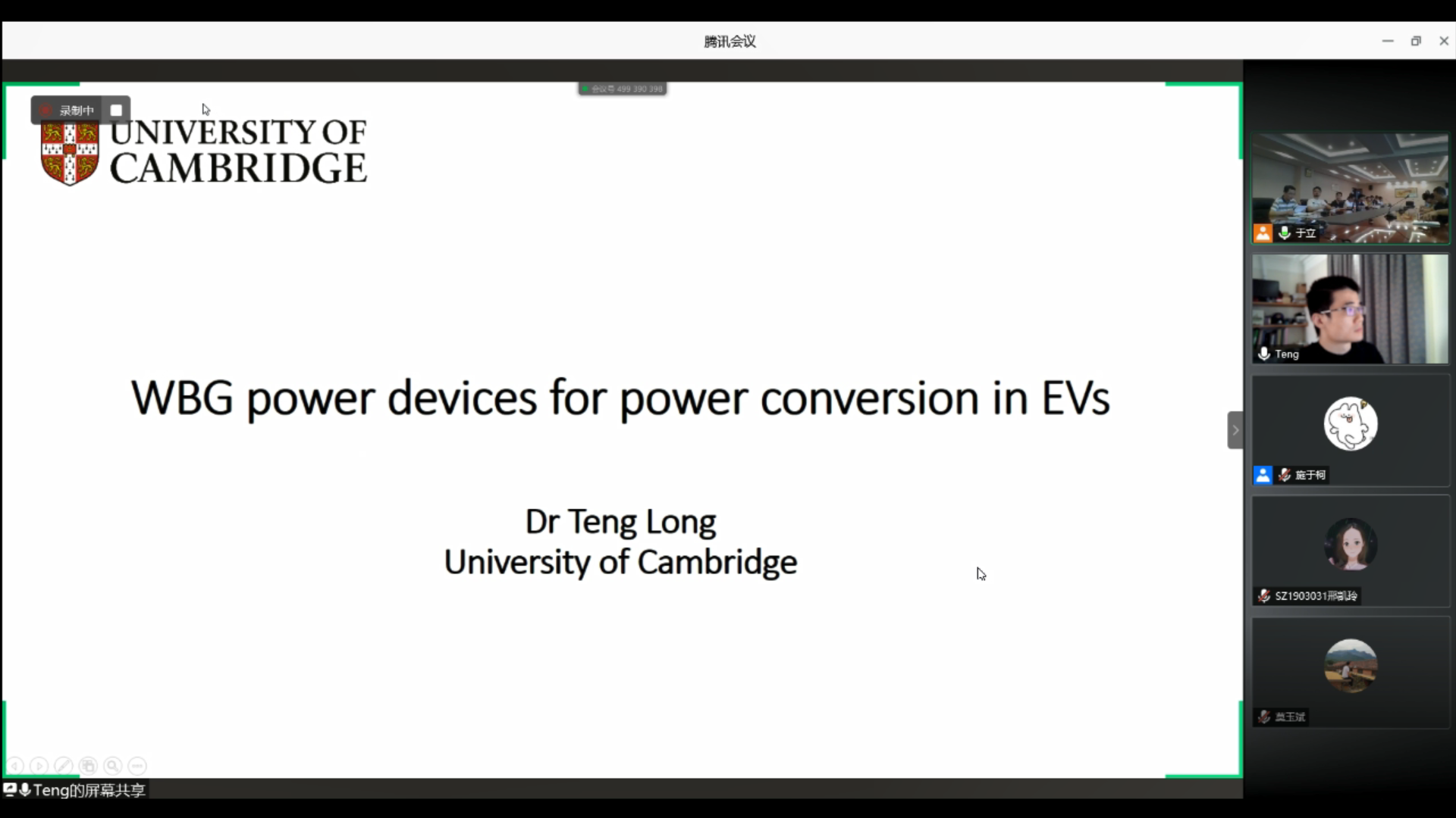 911日下午,剑桥大学应用电力电子实验室主任Teng Long老师应污污漫画 的邀请,通过腾讯会议作了题为《WBG power devices for power conversion in EVs》的在线学术报告。报告由污污漫画 副院长张卓然教授主持,学院20余位师生现场参会,另外,40余位师生在线参加了本次报告会。