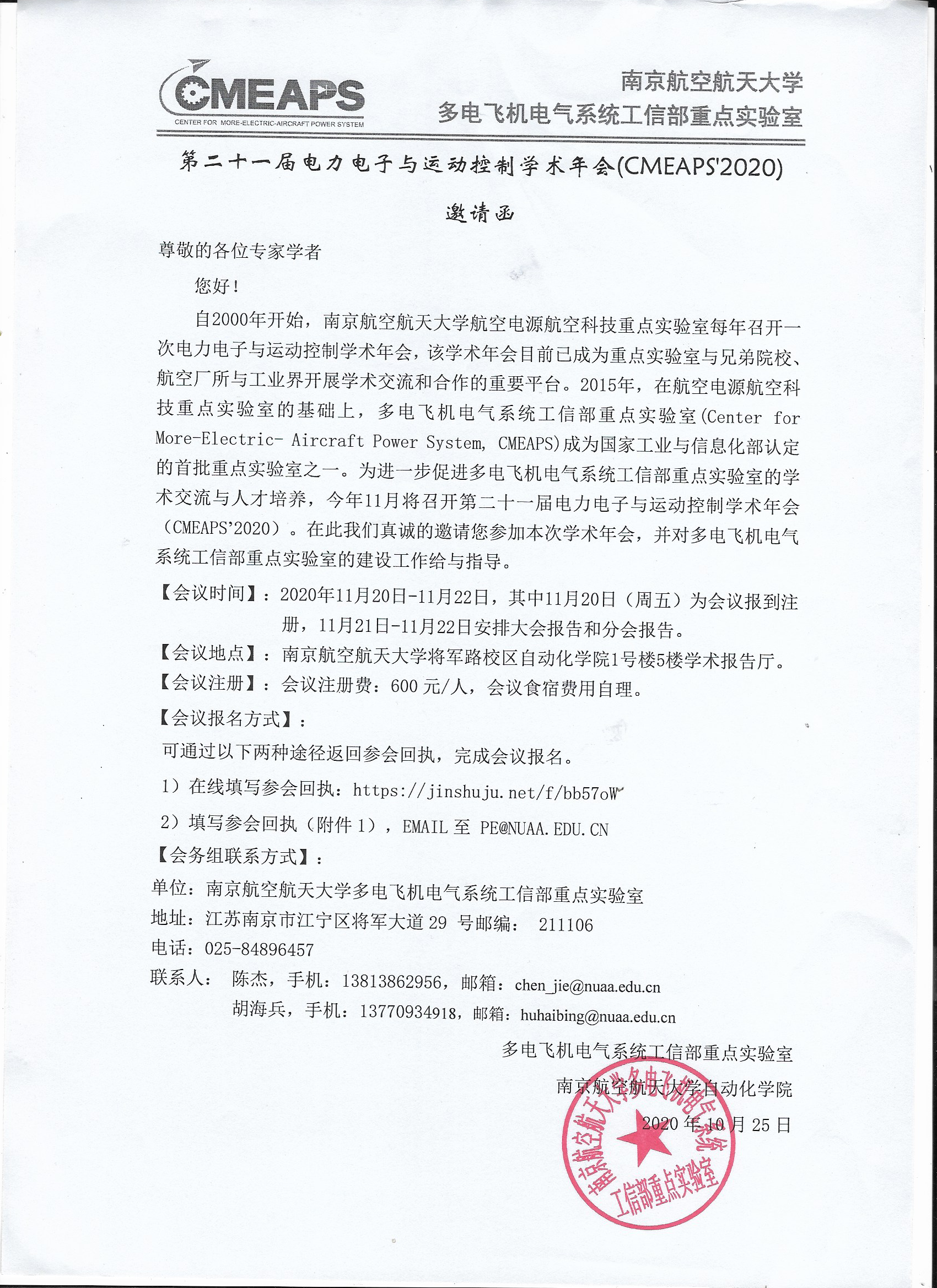 自2000年开始,南京航空航天大学航空电源航空科技重点实验室每年召开一次电力电子与运动控制学术年会,该学术年会目前已成为重点实验室与兄弟院校、航空厂所与工业界开展学术交流和合作的重要平台。2015年,在航空电源航空科技重点实验室的基础上,多电飞机电气系统工信部重点实验室(Center for More-Electric- Aircraft Power System, CMEAPS)成为国家工业与信息化部认定的首批重点实验室之一。为进一步促进多电飞机电气系统工信部重点实验室的学术交流与人才培养,今年11月将召开第二十一届电力电子与运动控制学术年会(CMEAPS’2020)。在此我们真诚的邀请您参加本次学术年会,并对多电飞机电气系统工信部重点实验室的建设工作给与指导。