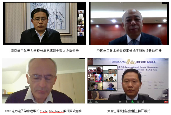 南京航空航天大学校长单忠德院士,中国电工技术学会理事长杨庆新教授,IEEE电力电子学会理事长Frede Blabbjerg教授出席开幕式并致欢迎辞。大会主席、南京航空航天大学阮新波教授主持大会并介绍会议筹备情况。本次会议通过ZOOM会议系统全程在线举行,并通过目睹直播系统全程直播。