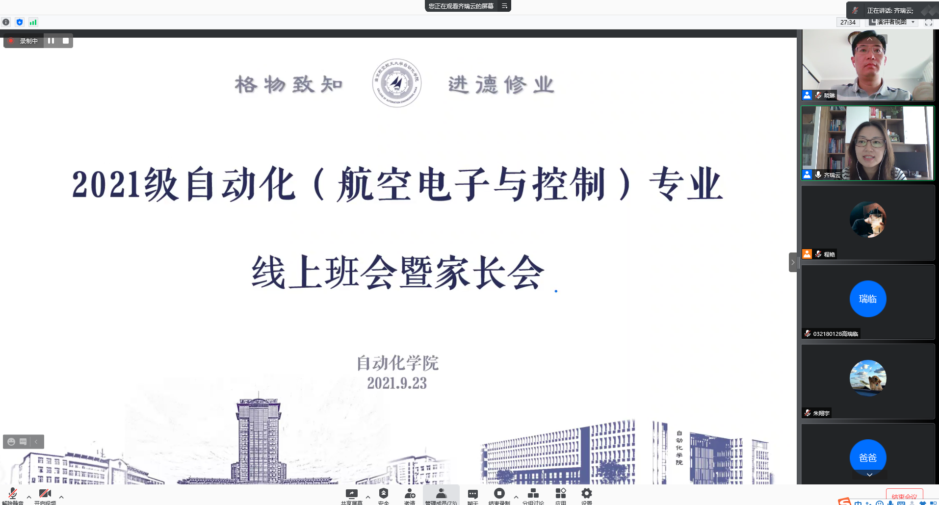 为帮助学生和家长了解中英班联合办学项目的详细情况,熟悉具体政策,9月23日下午,污污漫画 召开2021级中英班线上班会暨家长会。污污漫画 副院长王晓琳、党委副书记丁琛、专业负责人张绍杰、辅导员程艳以及全体0321801班学生和家长参加了本次会议,会议由中英班班主任齐瑞云主持。