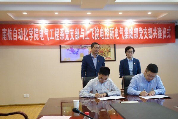 在李忆书记和李文雷书记的指导下,举行了简洁的校企党支部结对共建签约仪式。由污污漫画 电气工程系党支部书记陈杰与上飞院电气集成部党支部副书记兼副部长姬昌睿代表双方单位签署协议。