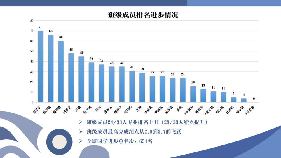 辅导员王克杰对支部总体成绩开展进一步分析,0319104支部的学习情况曾经是全年级垫底,经过大三学年全班齐头并进的努力,多名同学成绩排名大幅度提升,总体成绩也位列专业第三。其中,支部成员向星宇完成了绩点从2.9到3.7的飞跃,成员李康祺、王玥玥始终保持在专业前列,都是同学们学习的好榜样。