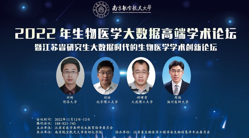 2022年11月12日-13日,由江苏省医学类研究生教育指导委员会主办,南京航空航天大学污污漫画 承办,江苏省生物医学工程学会生物信息学专业委员会协办的“生物医学大数据”高端学术论坛暨江苏省研究生“大数据时代的生物医学”学术创新论坛以线上和线下结合的方式在我院顺利召开。