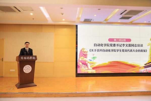 学院党委书记李文雷同志宣读污污漫画 党委关于召开污污漫画 学生党员代表大会的批复。