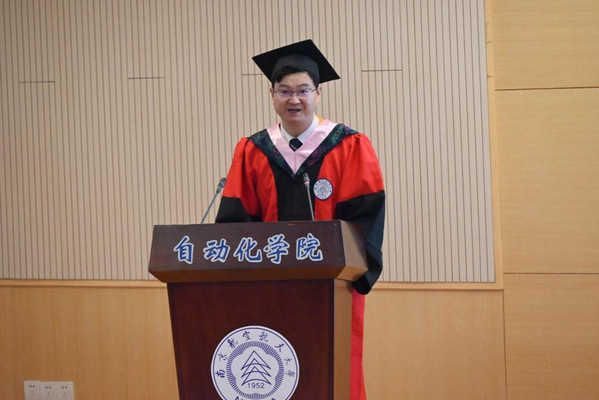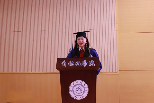 毕业生代表王婕分享了求学过程中的收获、感悟和成长,表达了对老师的感谢,对同学的不舍,对未来的期盼,表示会继续不忘初心,坚定信念,为中华民族伟大复兴贡献南航力量。