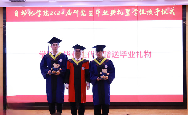 姜斌代表学院全体导师为毕业生赠送印有学院特色的纪念品,希望同学们牢记院训、院风,守正创新,让青春在奋斗中淬炼,踔厉奋发,取得更高成就。