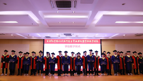 在学位授予仪式中,学院领导、院长助理和各系主任为全体毕业生们拨苏正冠,颁授学位证书,并拍照留念。