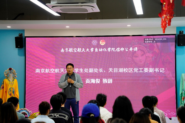 贡海俊为本次信仰公开课致辞,对高飞团队表示热烈欢迎。他表示,南航学子除了要学好专业知识,更要了解中华优秀传统文化。京剧作为中华传统文化的璀璨明珠,希望同学们通过高飞老师的演绎增进对京剧的了解,培养兴趣,涵养人文情怀,使其成为大学学习生活的调剂,为成长为社会栋梁和工程英才激发动力。