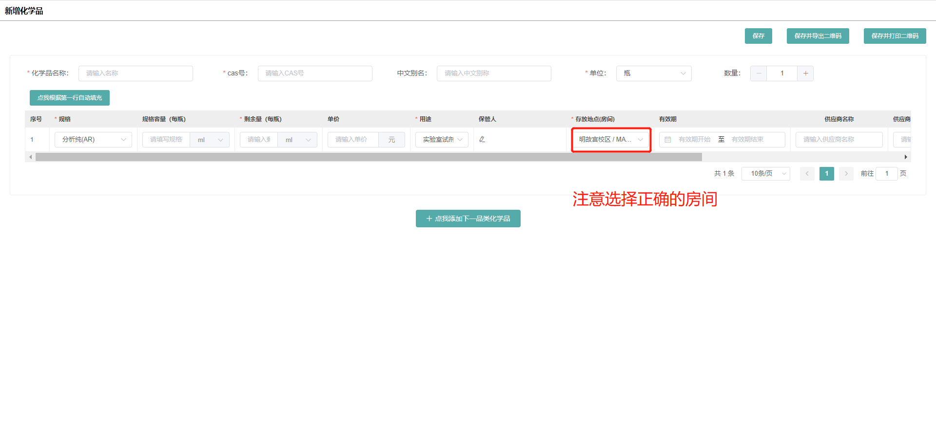 3.在化学品列表,设置要盘存的房间,筛选中房间中的化学品信息;