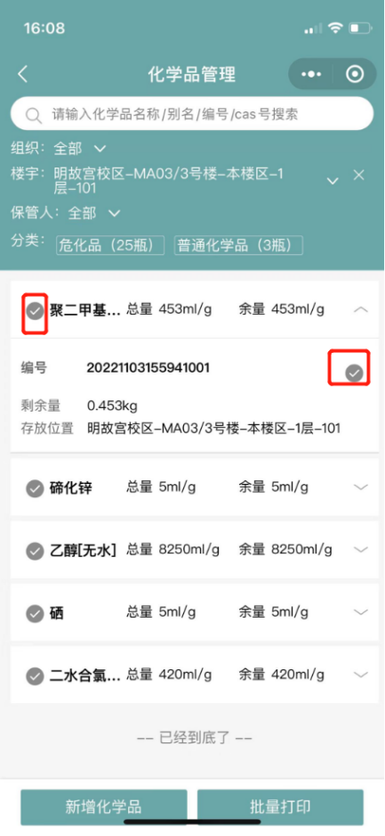 5.5如果需要打印系统化学品的二维码,则选择化学品后,点击下方的批量打印;