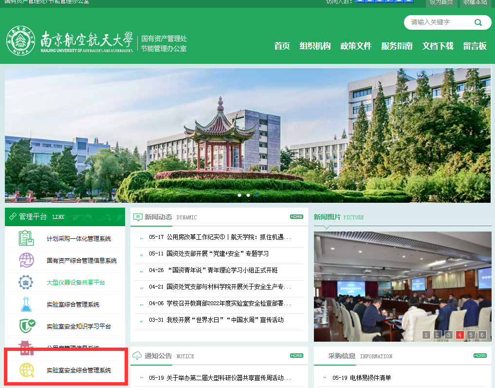 1.输入网址:gzc.wwmhgo.com,访问国资处网站,点击“管理平台”栏目-“实验室安全综合管理系统”,采用校内统一身份认证的方式登录,具体操作如下图: