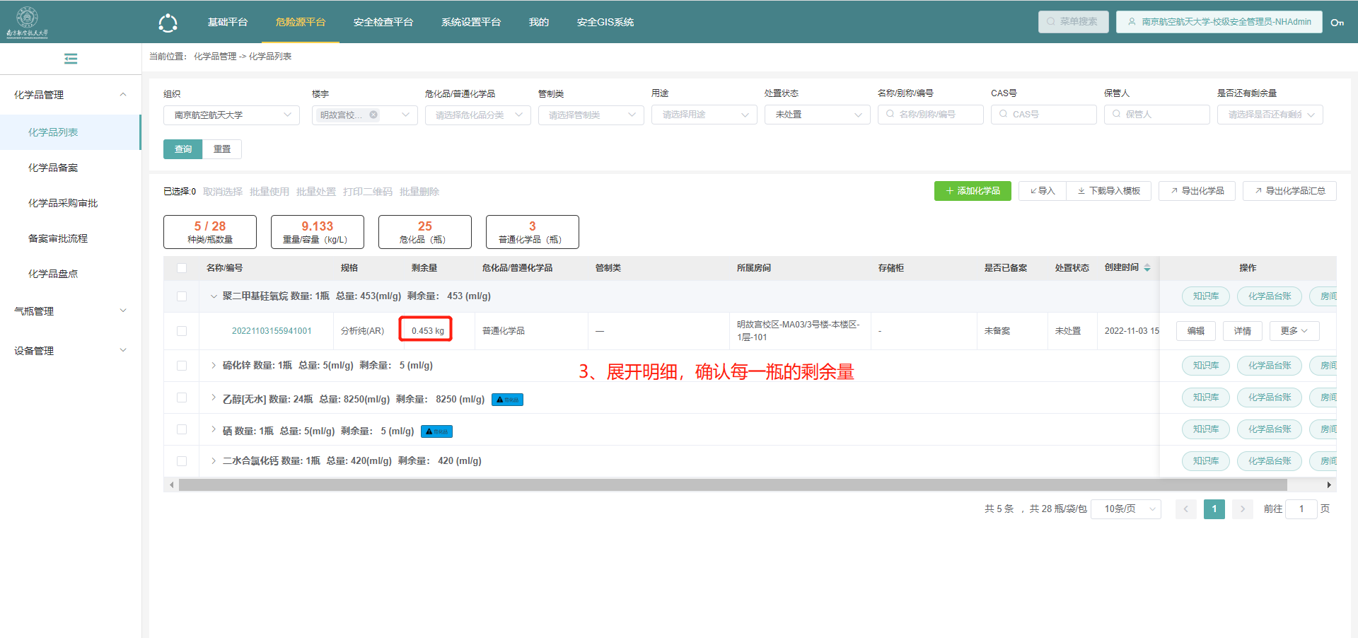 5.在确认了数量和剩余量后,点击此化学品,展开明细;确认每一瓶的剩余量;