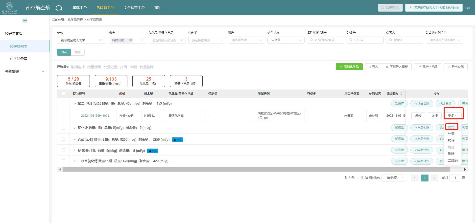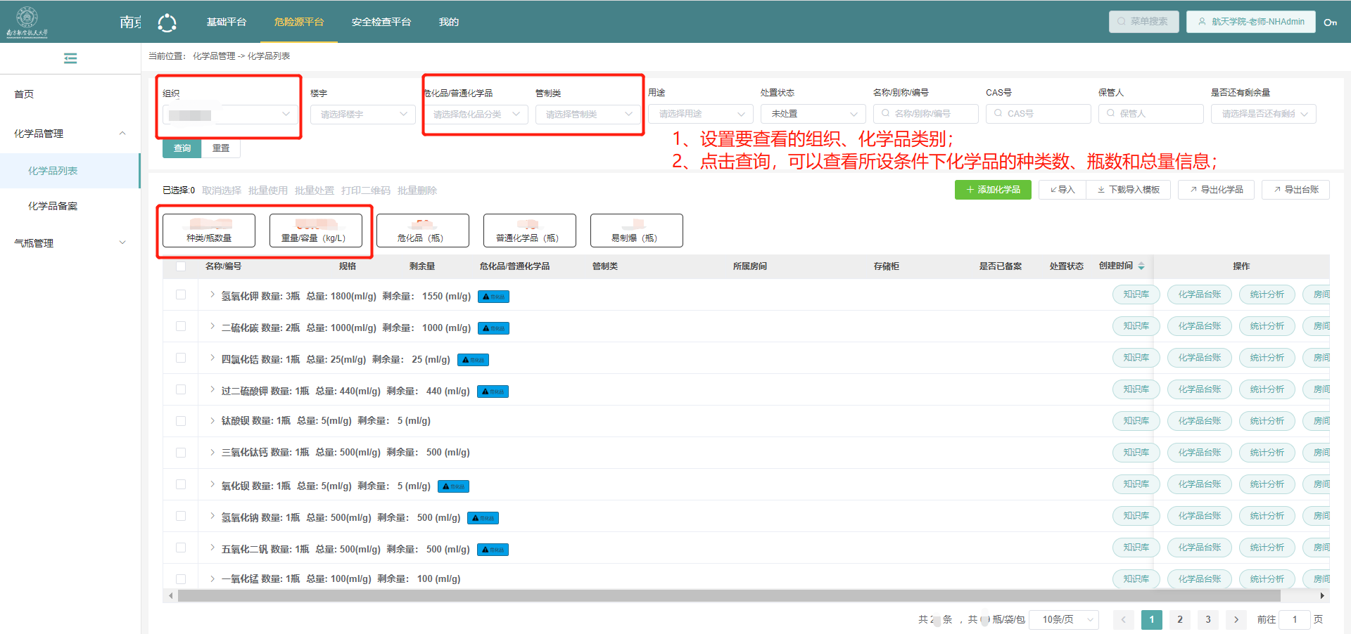 四、PC端查看本单位易制毒、易制爆、一般危化品、普通化学品的统计数据