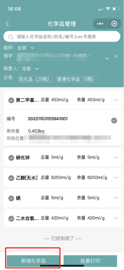 5.在确认了剩余量后,点击此化学品,展开明细;确认数量和每一瓶的剩余量;