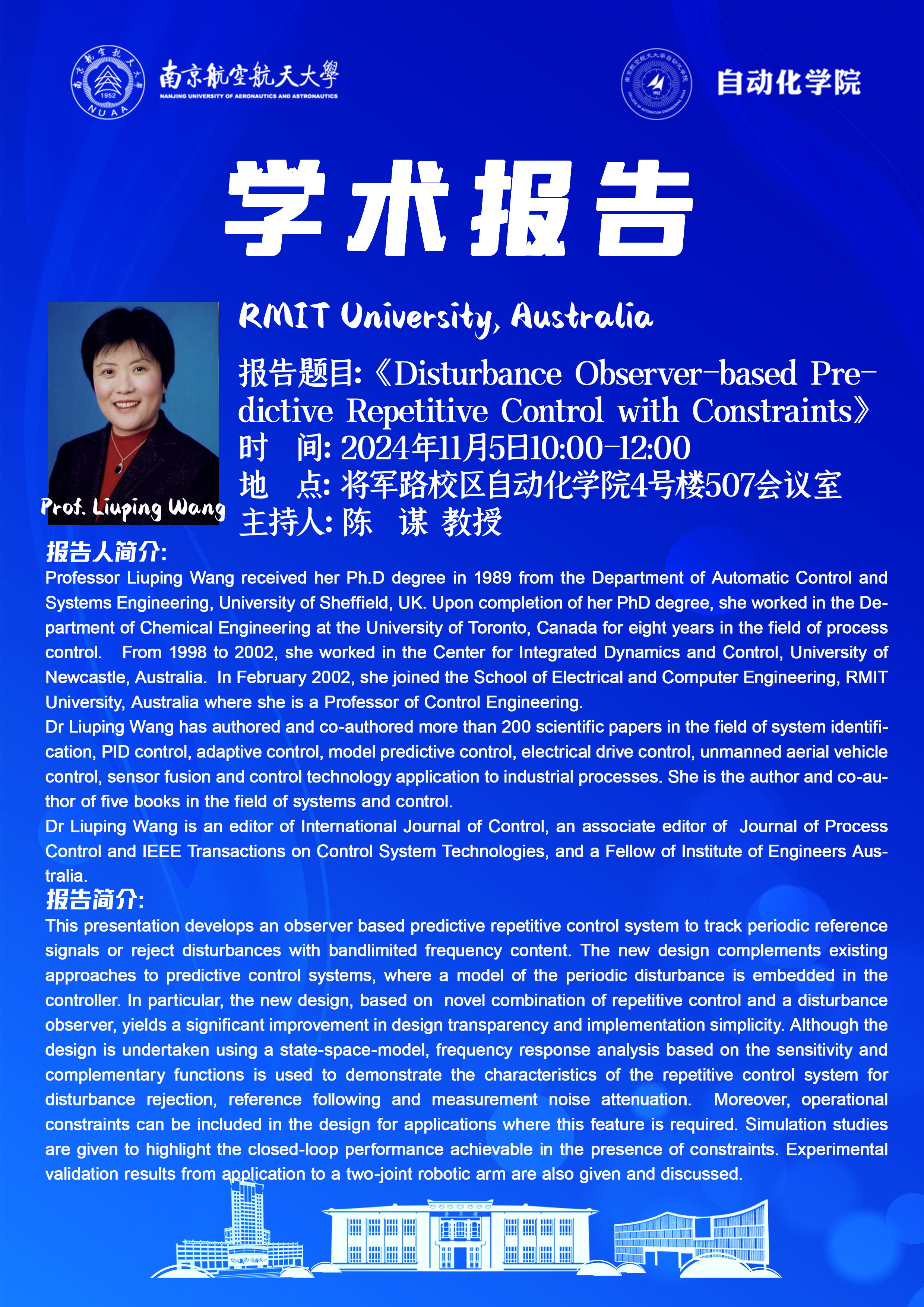 【学术报告】Liuping Wang :Disturbance Observer-based Predictive Repetitive Control with Constraints