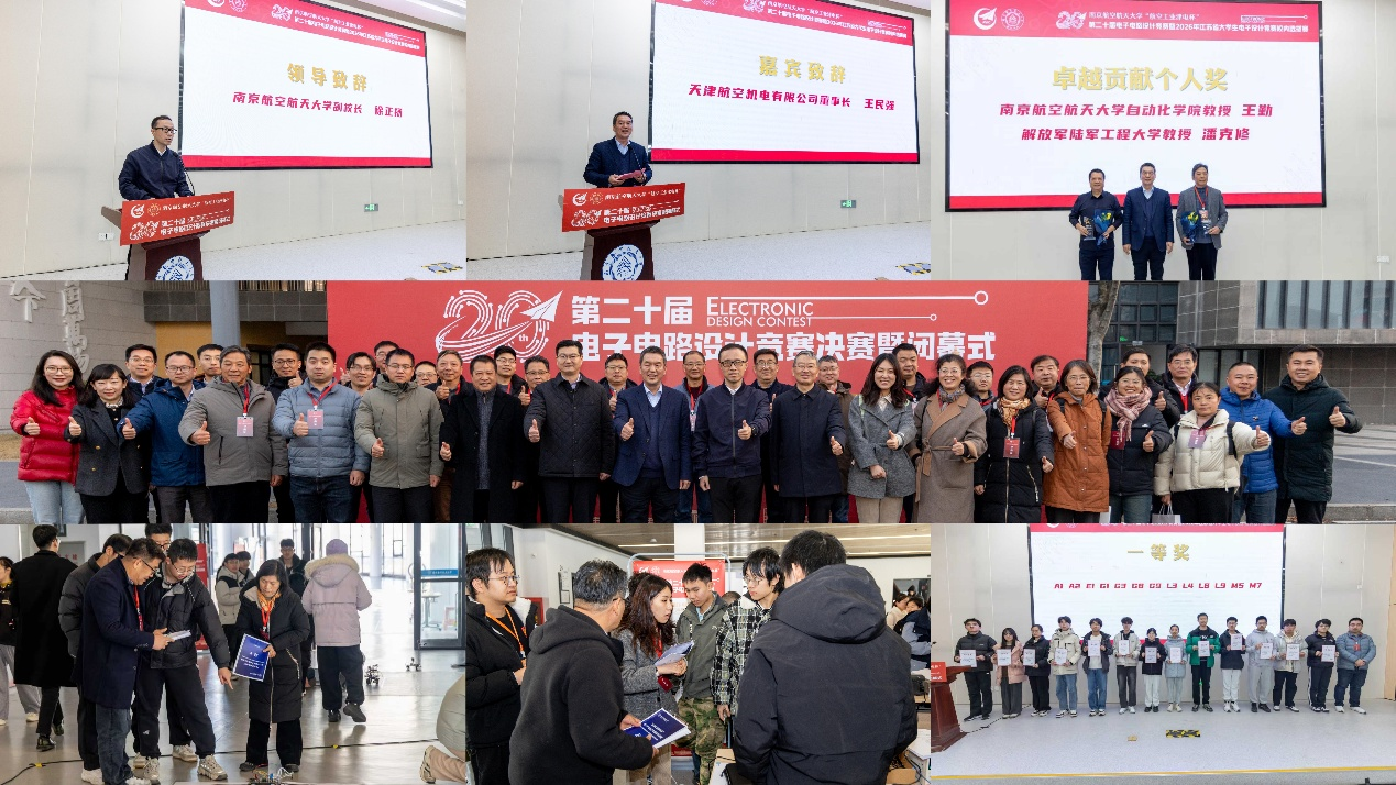 2026年1月7日,南京航空航天大学“航空工业津电杯”第二十届电子电路设计竞赛决赛暨闭幕式在天目湖校区牧星楼举行。本届竞赛适逢二十周年里程碑,意义非凡。天津航空机电有限公司董事长王民强、人力资源部部长李宏义,南京凌殴创芯电子有限公司总经理助理章喆特邀出席活动。南京航空航天大学副校长徐正扬,教务部副部长李鑫,牧星学院院长蒋彦龙,学生处副处长张建辉,校团委副书记张瀚文,天目湖校区管委会副主任潘顺荣,污污漫画 党委书记李文雷,牧星学院党委副书记兼致慧书院执行院长丁琛,以及污污漫画 的领导和老师出席了闭幕式。来自陆军工程大学、东南大学等高校的8名资深评审专家,以及校内16名评委老师共同见证了本届赛事盛会。