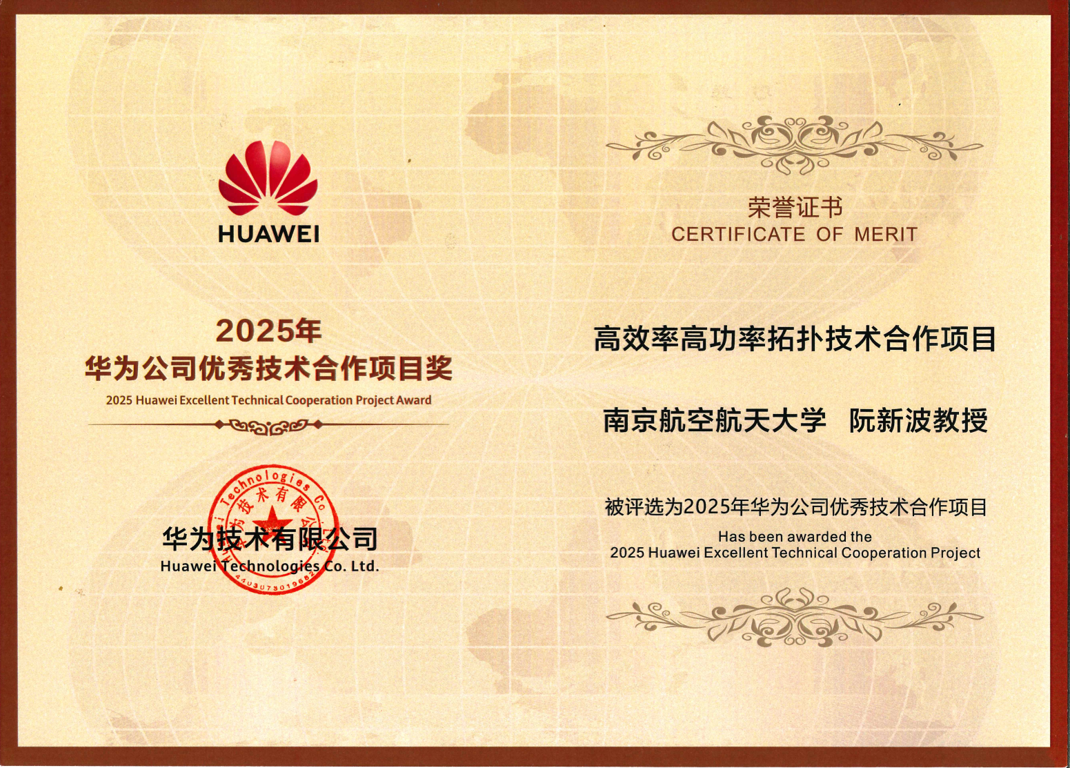 近日,我院阮新波教授团队与华为终端公司的合作项目“高效率高功率拓扑技术”荣获2025年华为公司“优秀技术合作项目奖”。该奖项旨在表彰在技术前沿探索、产业难题攻克及创新成果落地方面取得卓越成效的产学研合作典范。据了解,该奖项有3000多项成果参评,经严格评选,仅评出10项。在颁奖仪式上,华为终端公司相关负责人总结了项目成果,并介绍了成果在华为产品中的落地情况,对阮新波教授团队和南航污污漫画 给予了高度评价。